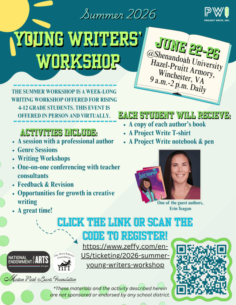 Join us for our weeklong workshop for rising 4th-12th graders at Shenandoah University’s main campus in Winchester, Va. Young writers will work with our Teacher Consultants to develop their writing as well as join workshops with their peers and talented, award-winning writers in conjunction with the Children’s Literature Conference.